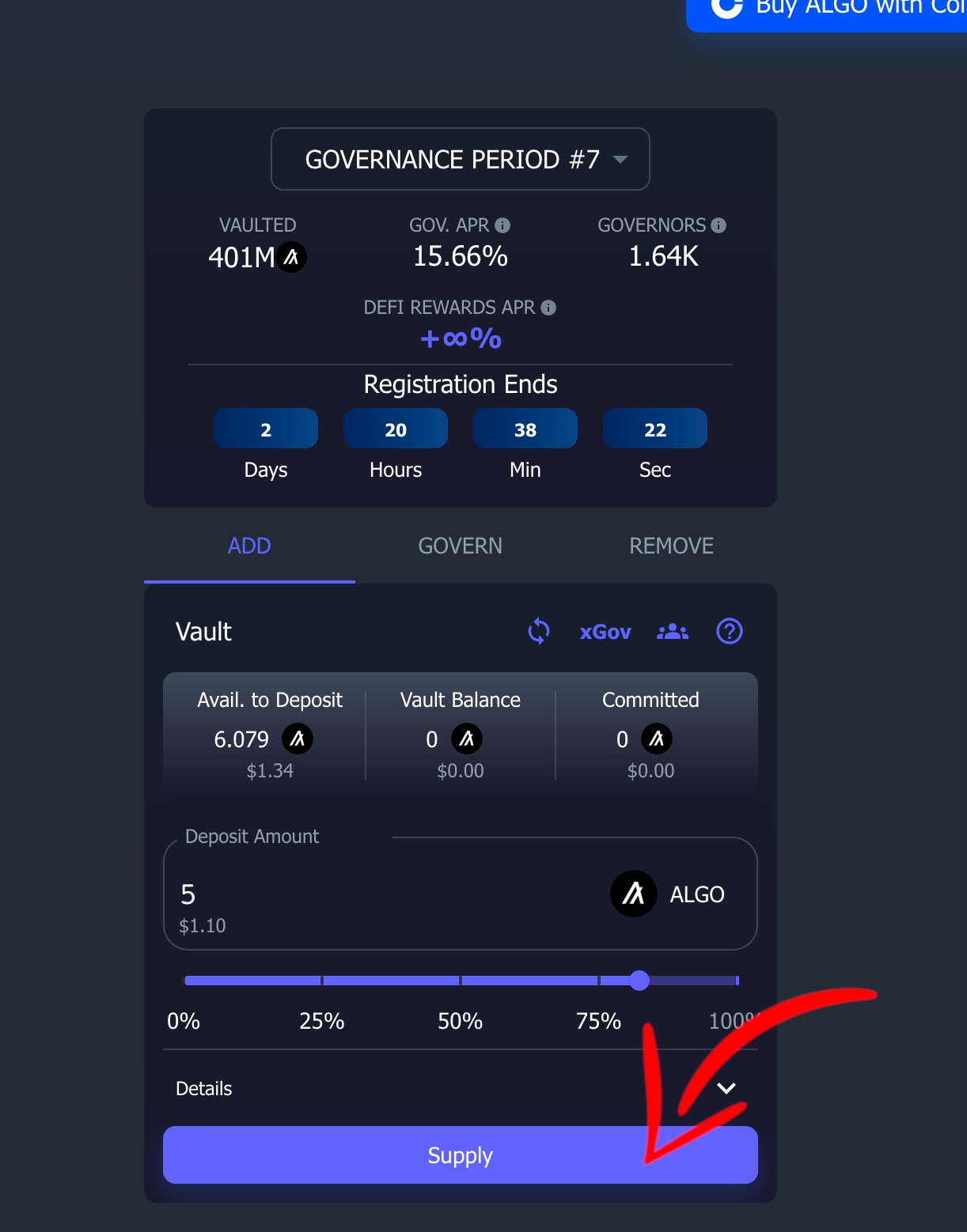 11. Toujours dans l’onglet “ADD”, vérifiez le nombre d’ALGO que vous souhaitez déposer dans le coffre-fort d’Algofi et cliquez sur “Supply”.