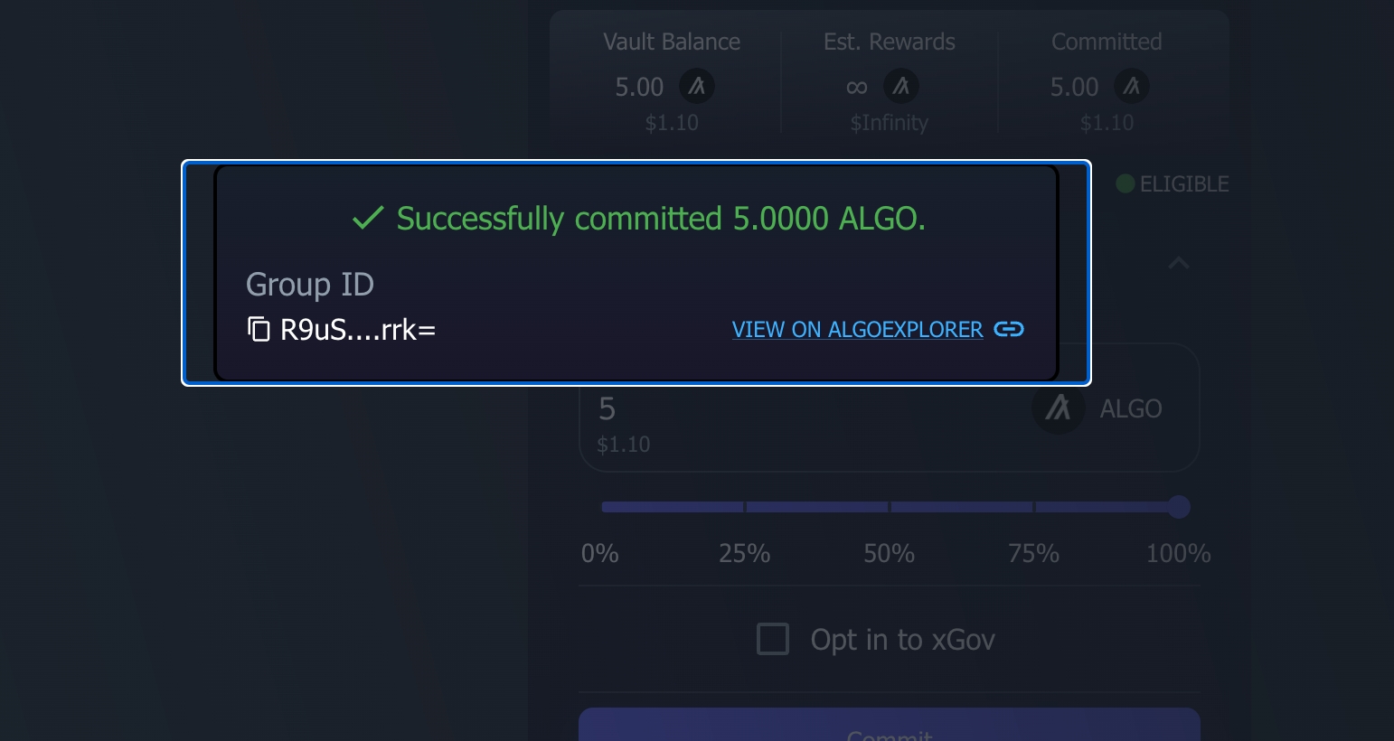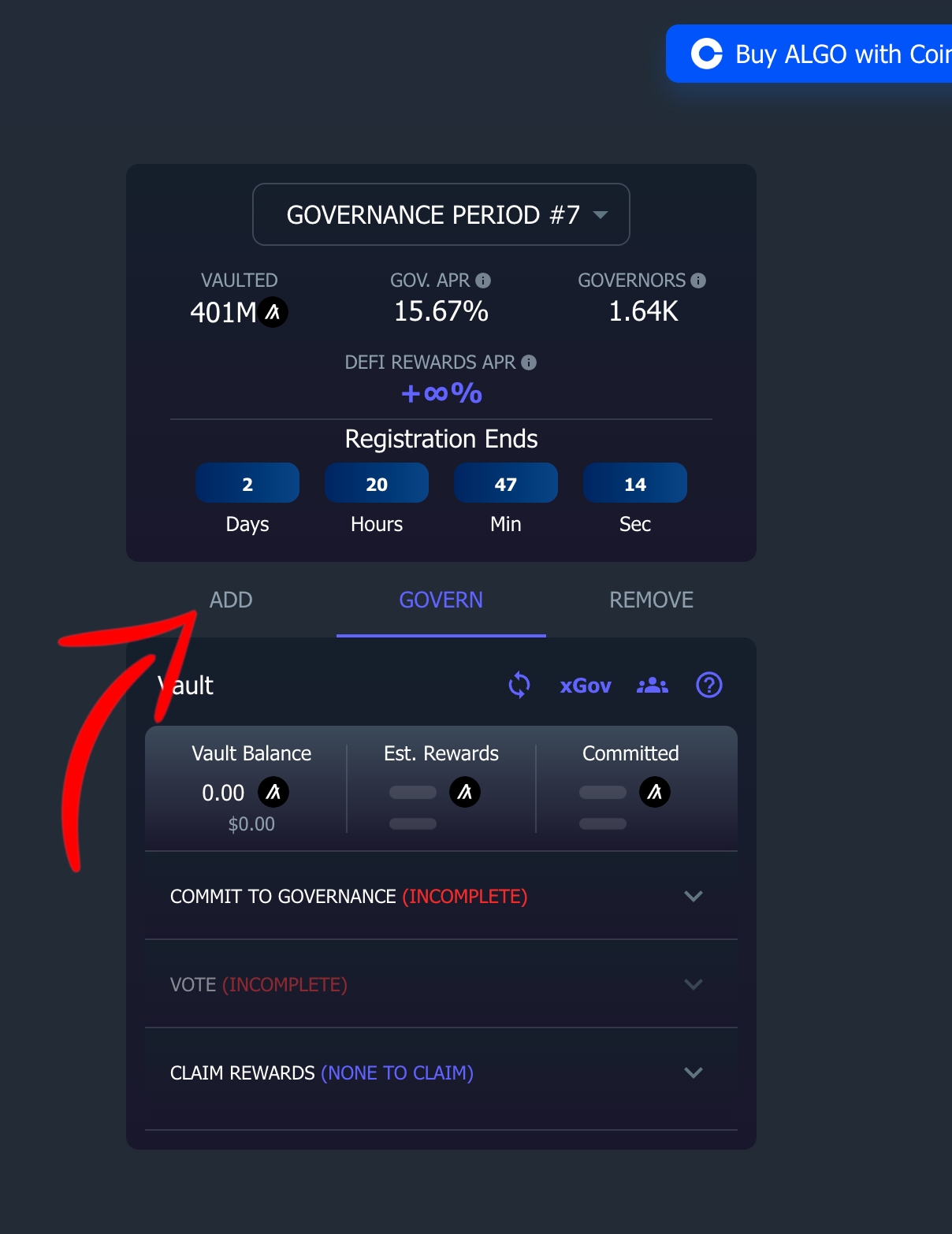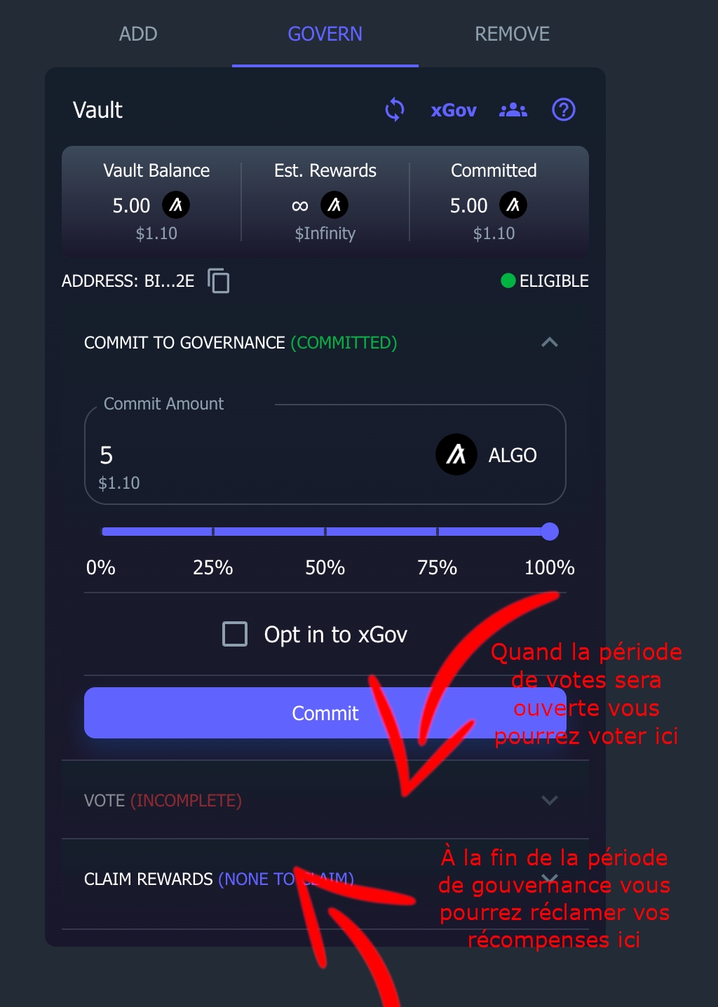 Attention, si vous avez des ALGO du coffre-fort engagés dans la gouvernance et que vous les retirez, votre statut de gouverneur passera à “INELIGIBLE” et vous ne recevrez pas vos récompenses de gouvernance.