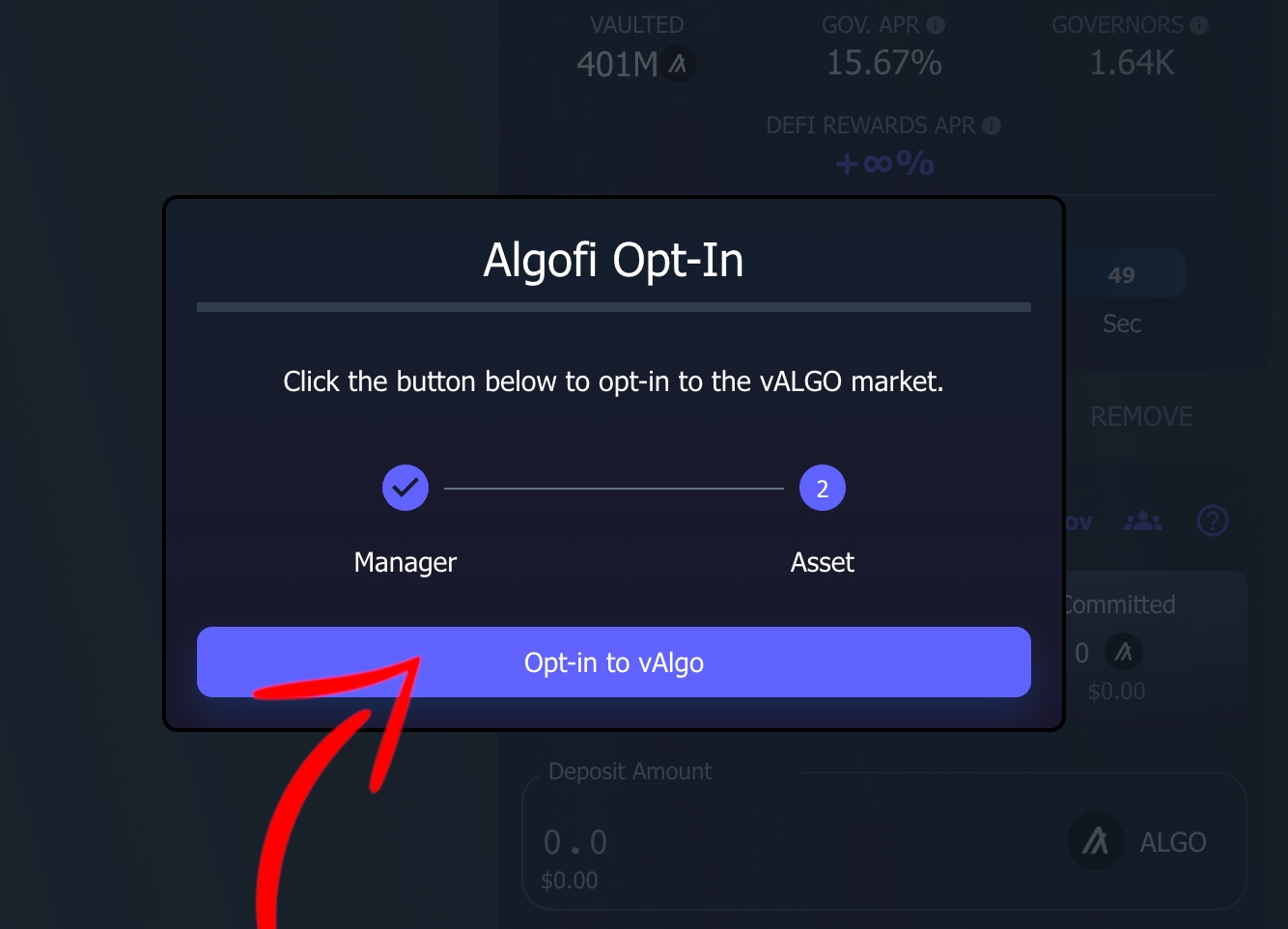 6. Dans la case “Deposit Amount”, indiquez le nombre d’ALGO que vous souhaitez déposer dans le coffre-fort d’Algofi (et que vous pourrez ensuite engager dans la gouvernance d’Algorand).