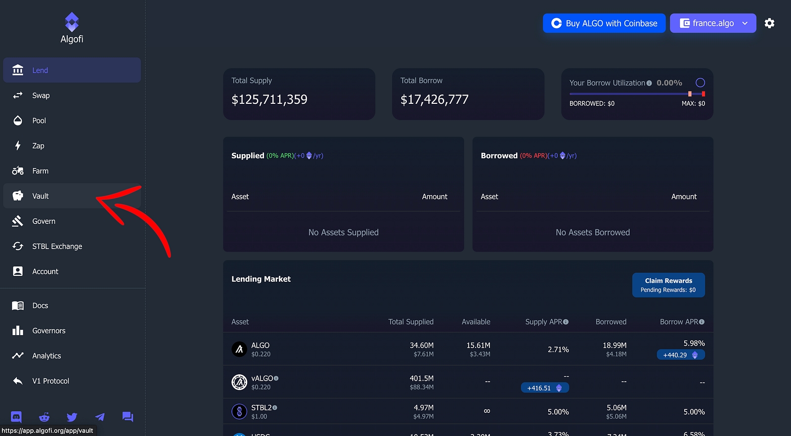 4. Quand votre adresse Algorand est connectée au site, cliquez sur “Vault” dans le menu à gauche. Il s’agit d’une sorte de coffre-fort où vous allez pouvoir déposer des ALGO sur Algofi.