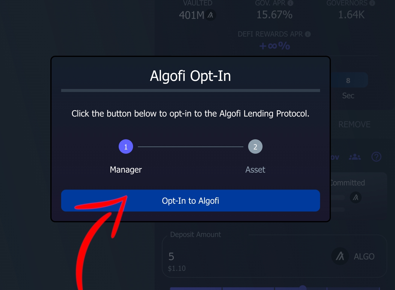 7. Sur la nouvelle fenêtre cliquez sur “Opt-In to Algofi”.