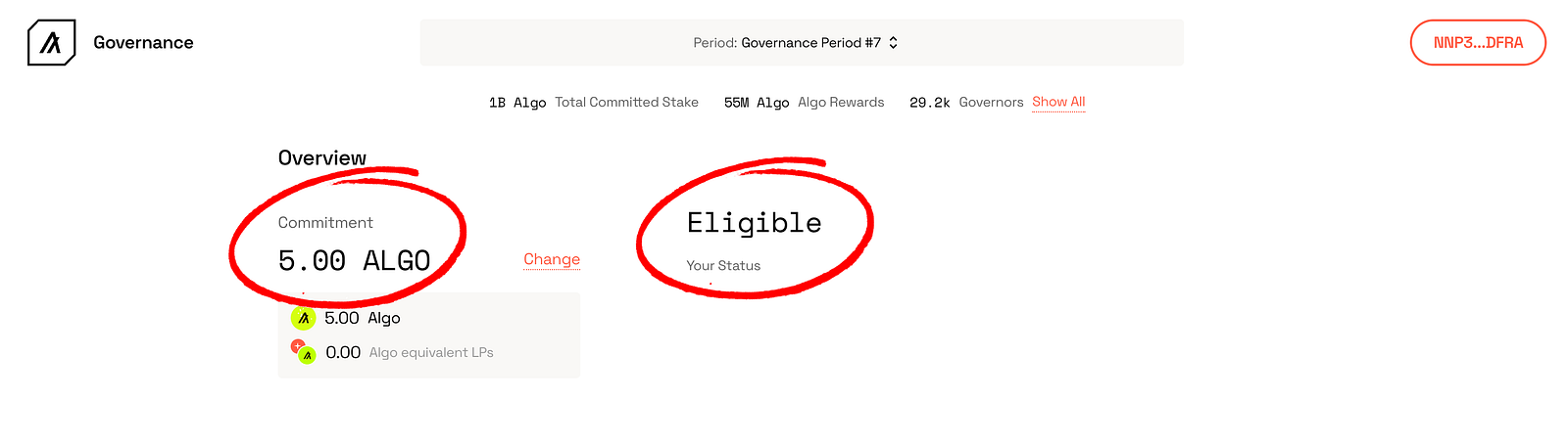 9. Sur la page principale du portail de la gouvernance, vous pouvez désormais voir le nombre d’ALGO que vous avez engagés dans la gouvernance et votre statut de gouverneur.