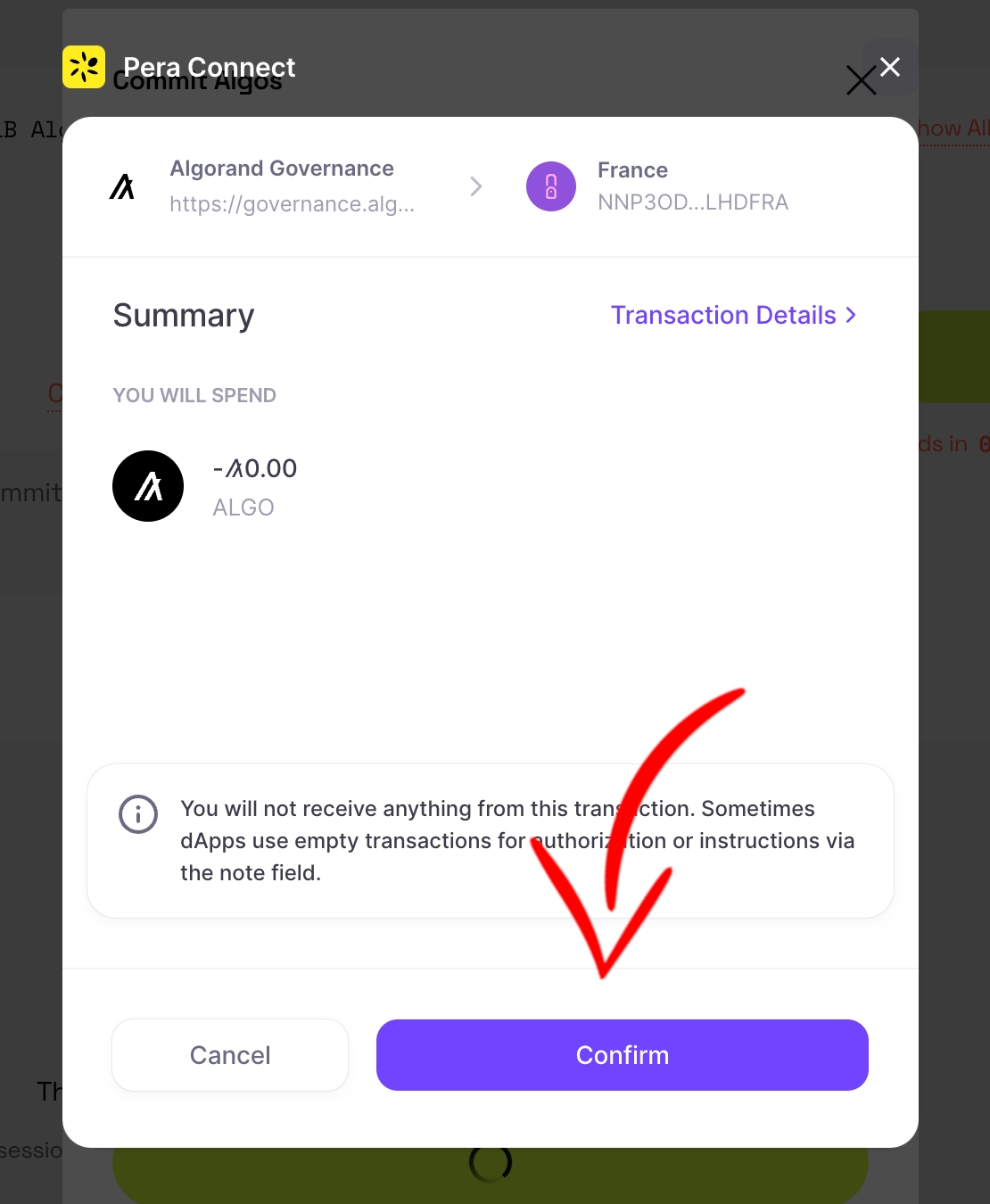 7. Vous aurez ensuite une transaction de 0 ALGO à signer.
