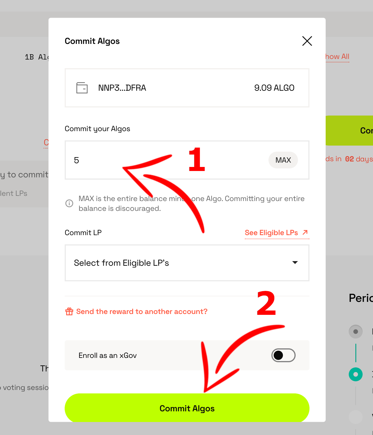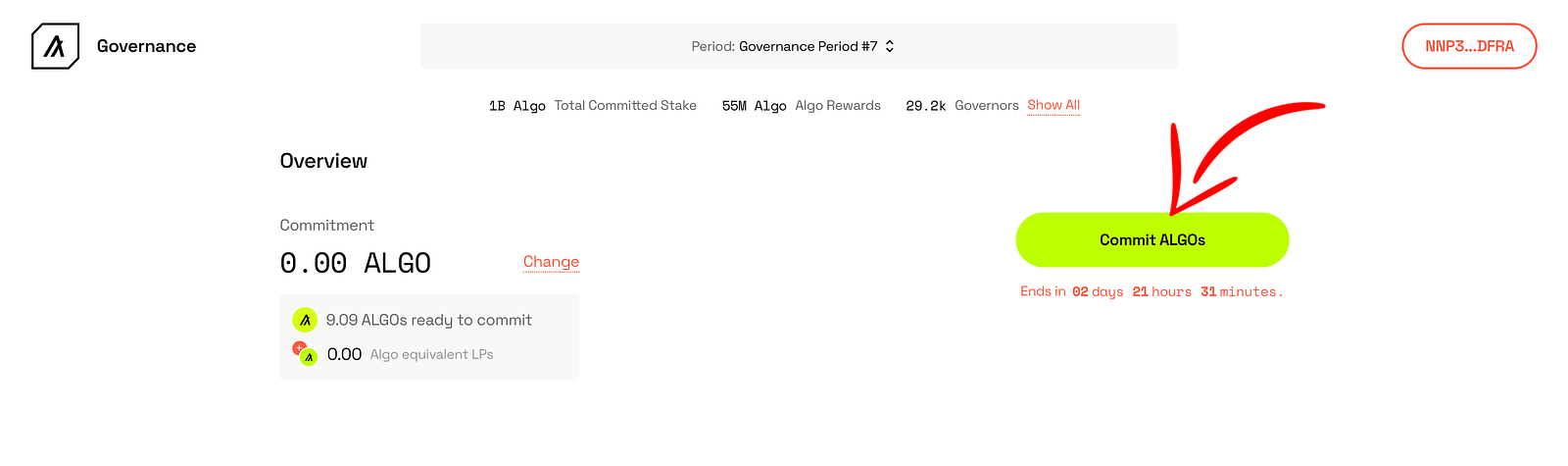 6. Dans la case “Commit your ALGOs” vous devez indiquer le nombre d’ALGOs que vous souhaitez engager dans la gouvernance.