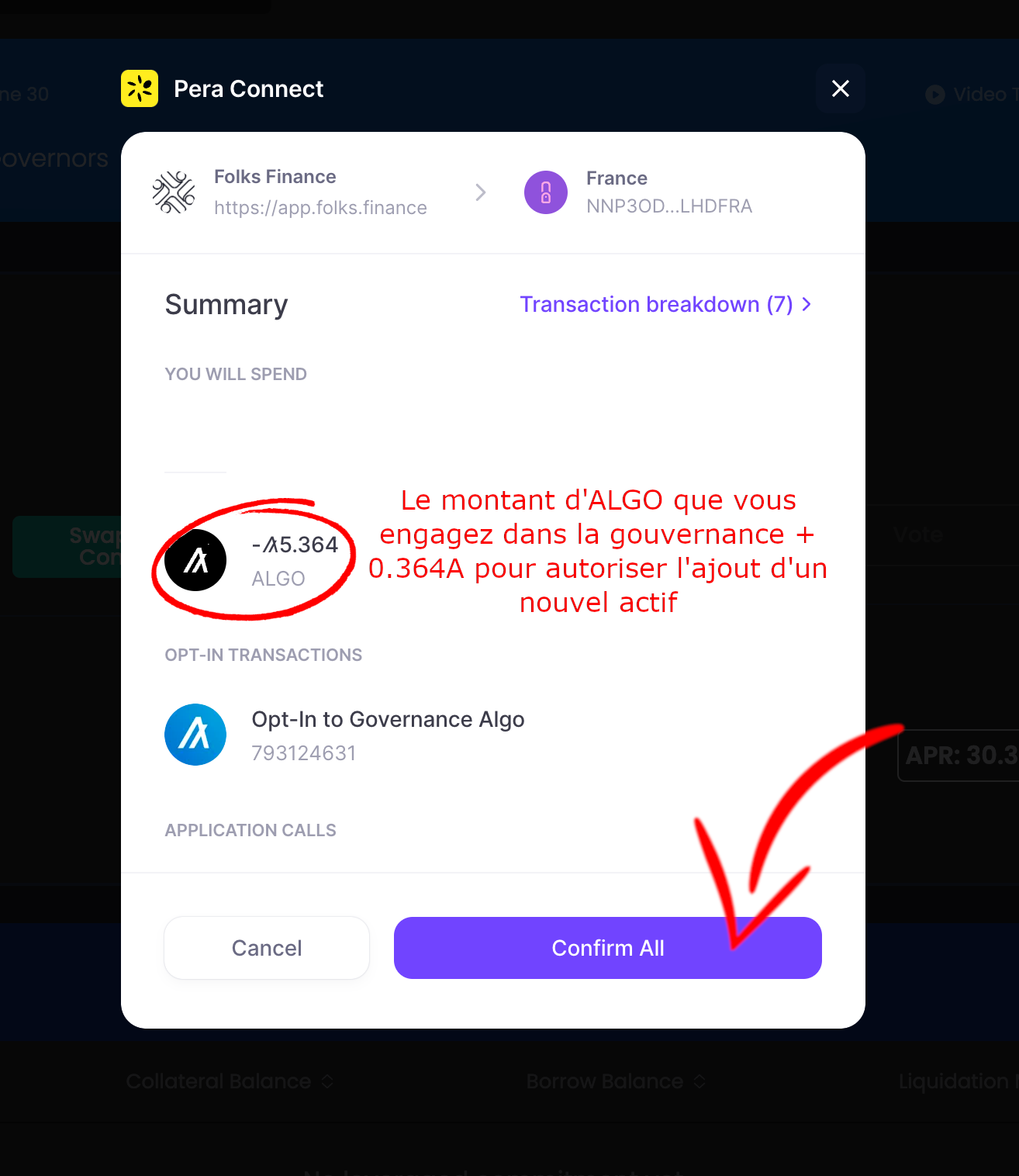 8. Vous avez ensuite une transaction à signer comportant le montant d’ALGO que vous allez engager dans la gouvernance.