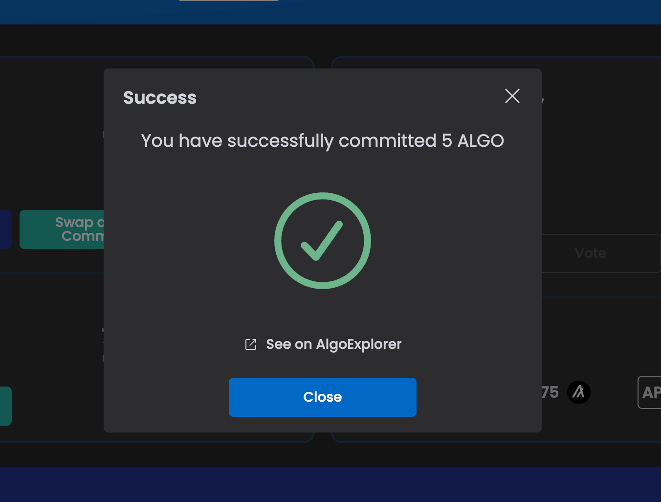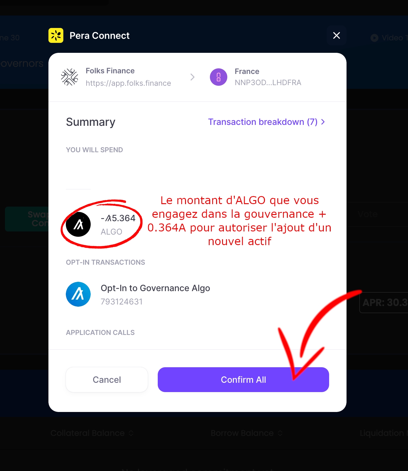 9. Quand c’est signé vous avez un message vous indiquant que vos ALGO sont désormais engagés dans la gouvernance d’Algorand via Folks Finance.