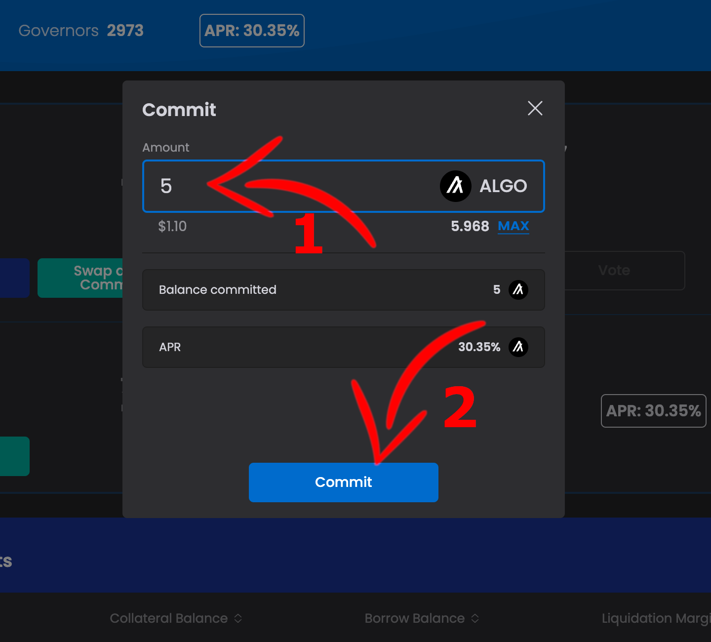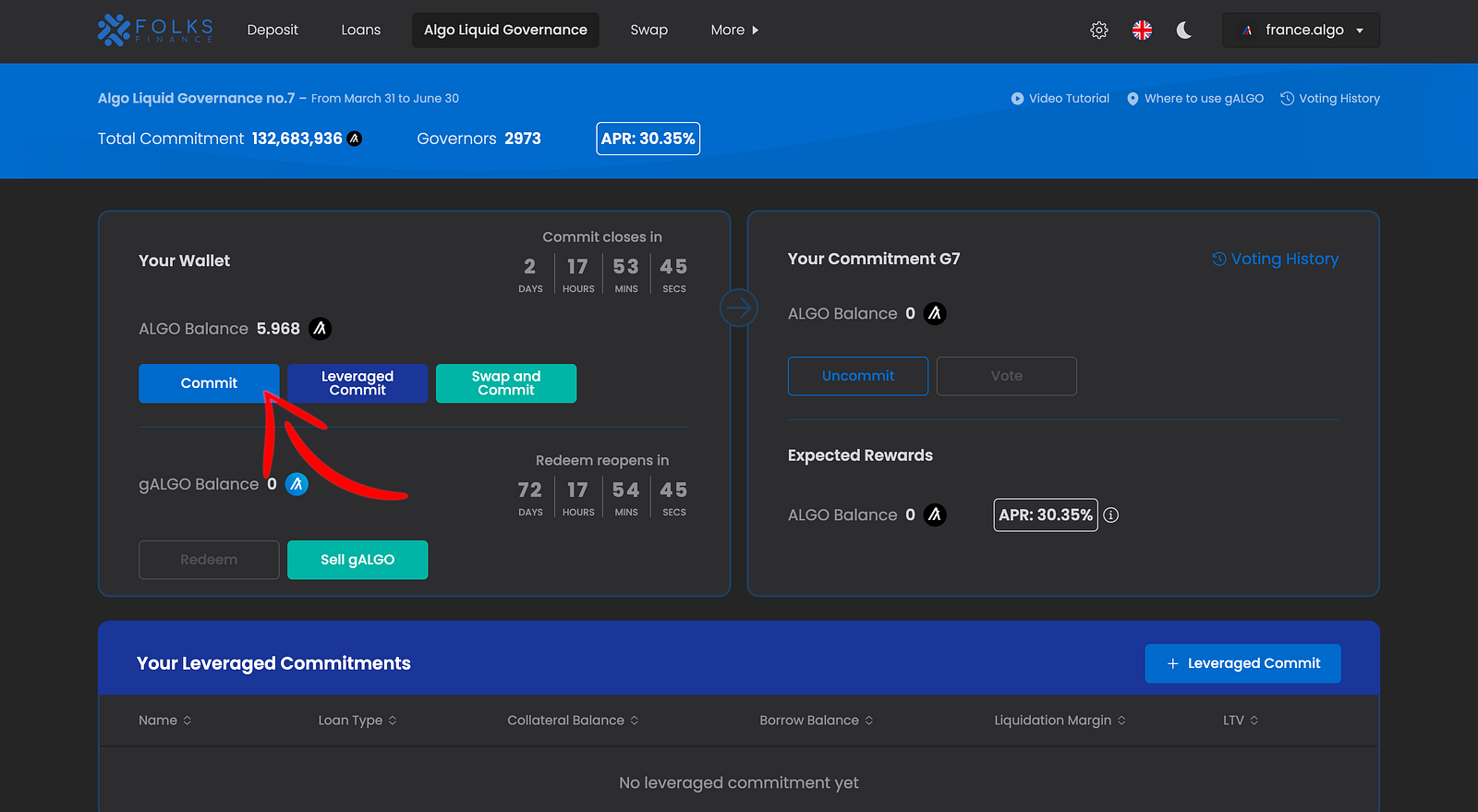 7. Dans la case “Amount” indiquez le nombre d’ALGO que vous souhaitez engager dans la gouvernance d’Algorand puis cliquez sur “Commit”.