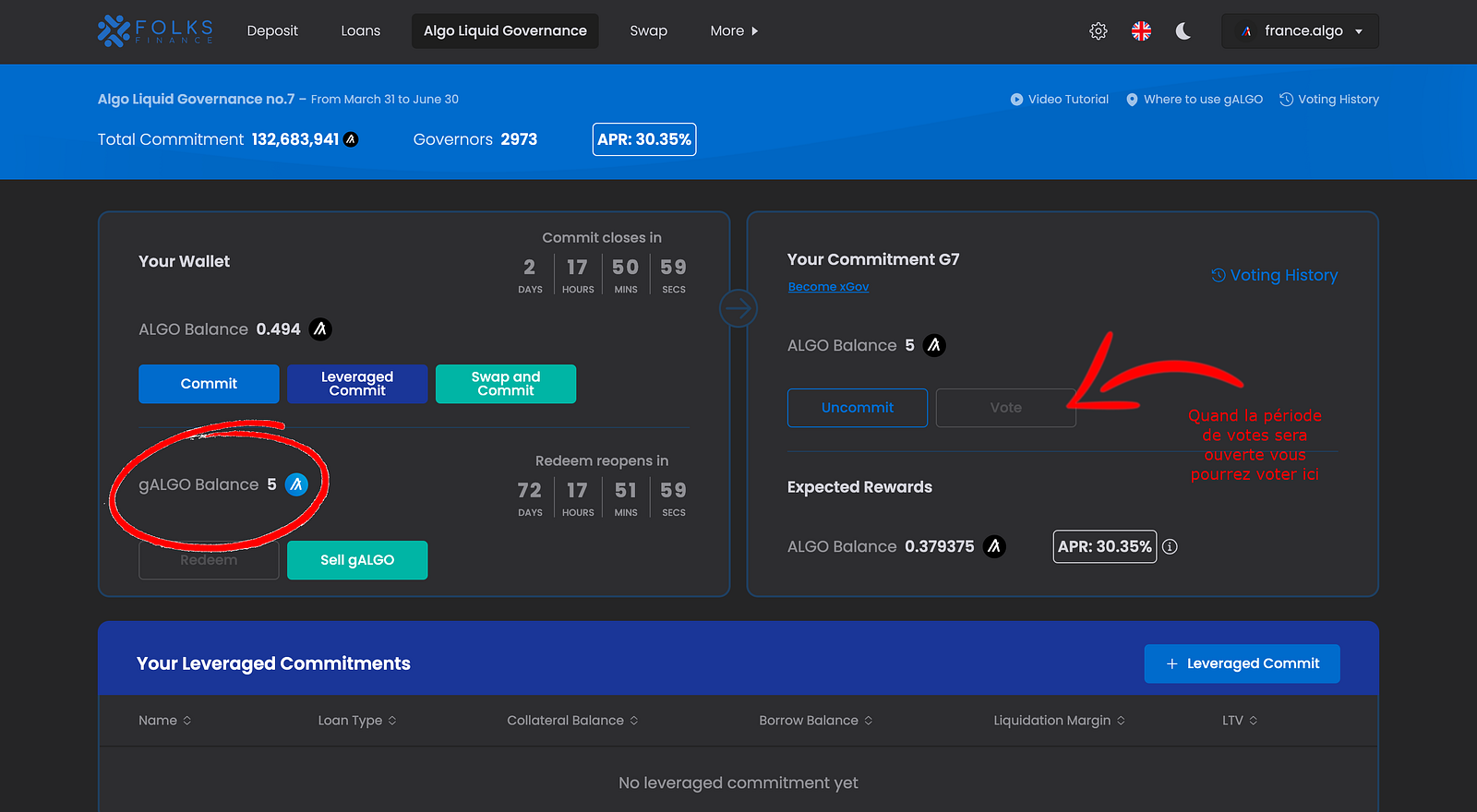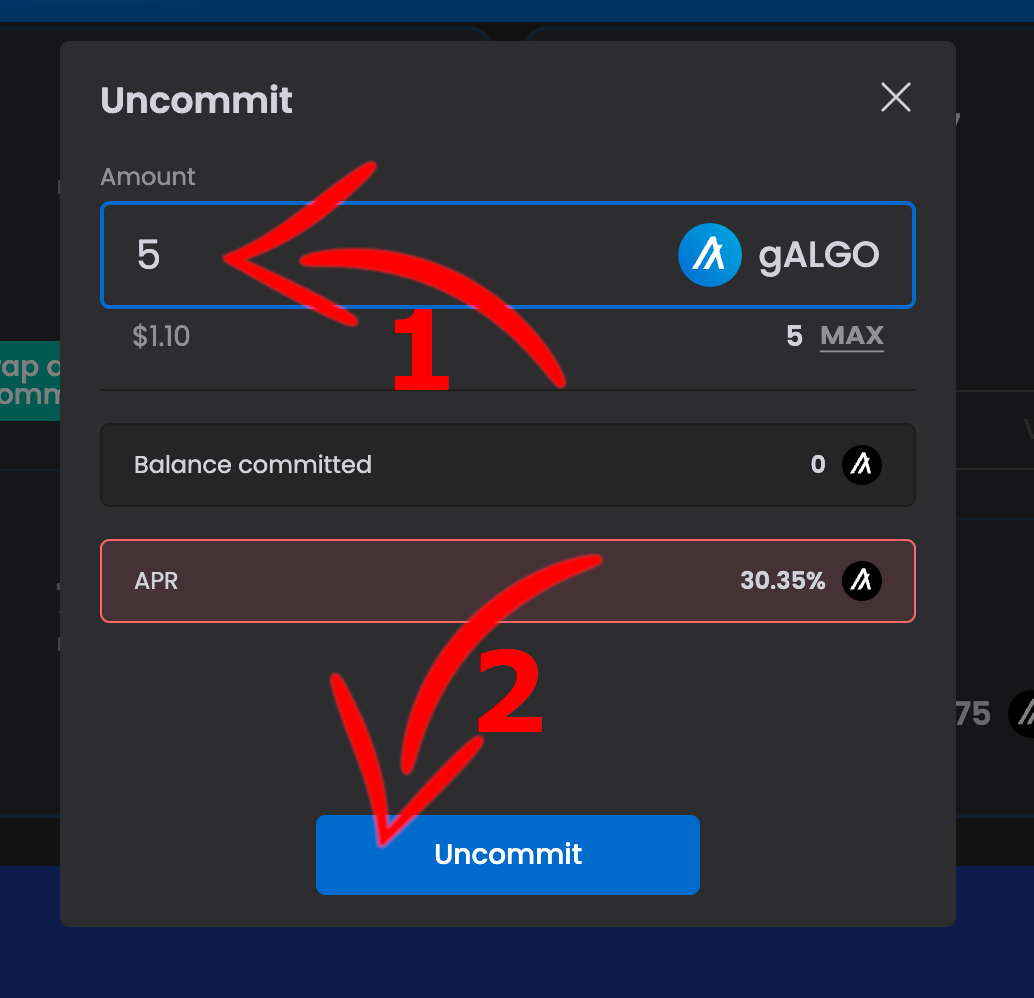 11. Si vous souhaitez retirer vos ALGO de Folks Finance, il vous suffit tout simplement de cliquer sur “Uncommit”, puis d’indiquer le montant de “gALGO” que vous souhaitez rendre et de cliquer à nouveau sur “Uncommit”.