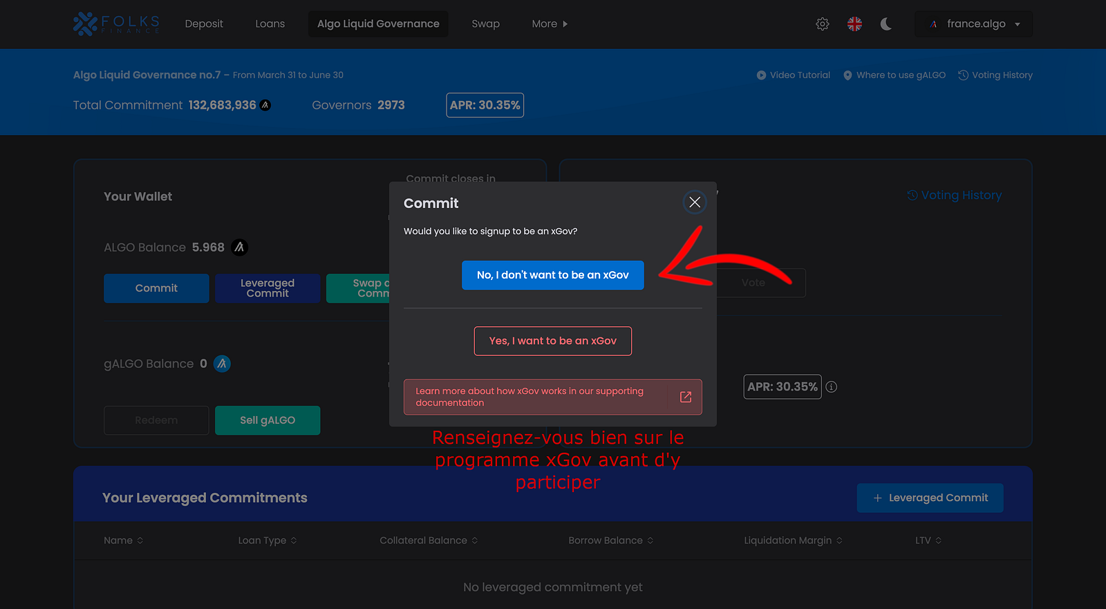 6. Ici Folks Finance vous demande si vous souhaitez participer à la gouvernance en tant que xGov (Gouverneur expert) ou non.